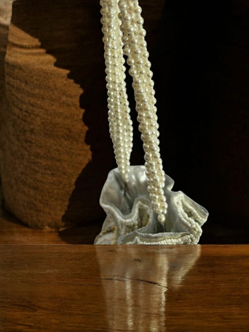 The intricate vertical embellishments and crystal-laden drawstring exude royal allure, while the beaded handle offers ease and style. Ideal for wedding soirées, festive nights, or glamorous cocktail events, this clutch promises to be the star of your outfit.