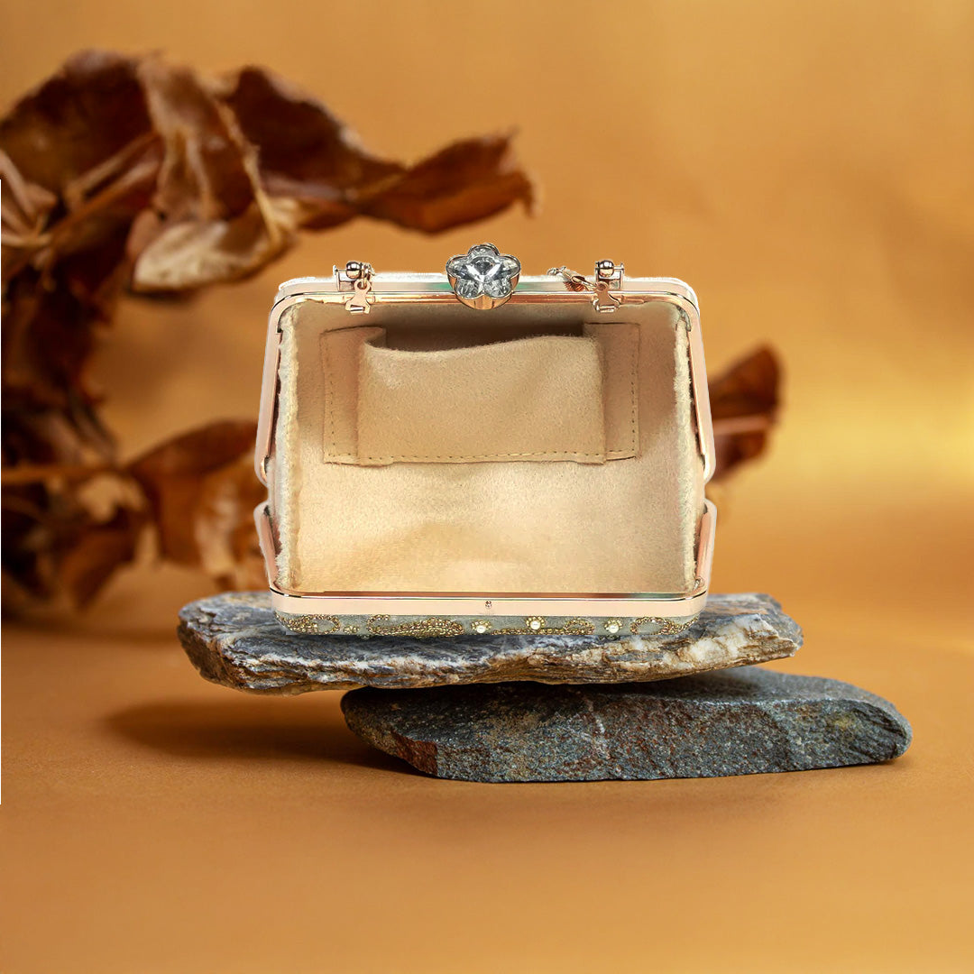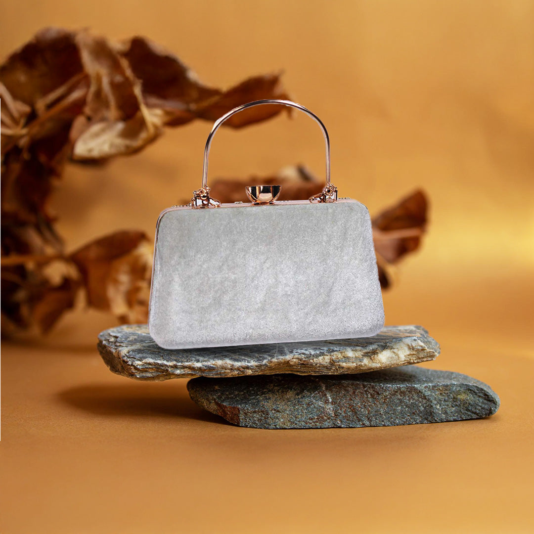 Exude royal charm with the Gold Paisley Embroidered Evening Clutch-light blue exquisitely hand-embroidered with shimmering zardozi paisley motifs and pearl embellishments. The white velvet base sets a graceful tone, while the gold handle and crystal clasp offer a luxe finish. Perfect for bridal wear, festive soirées, or formal evenings.