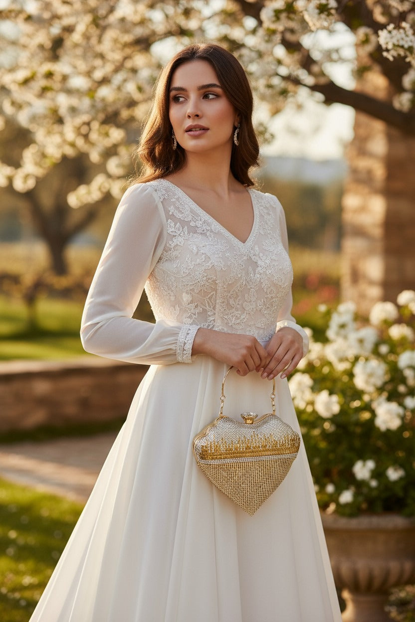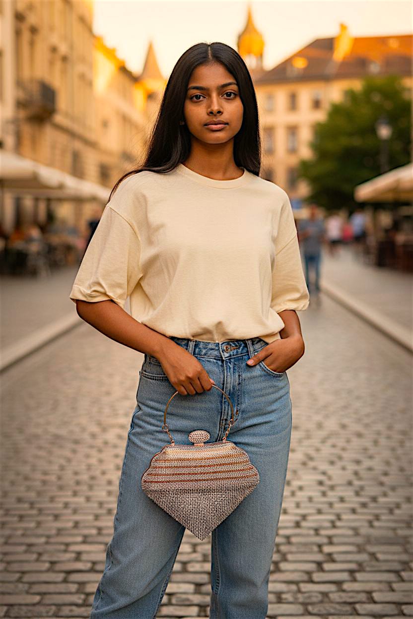 Make a bold style statement with the Metallic Chain Fringe Evening Clutch-v shape clutch Metal Handle. This uniquely sculpted clutch, resembling a radiant heart, is embellished with shimmering crystals that reflect light beautifully. The luxe gold-tone metal handle and diamond-shaped clasp add a refined touch, making it an ideal companion for weddings, galas, or festive soirées.