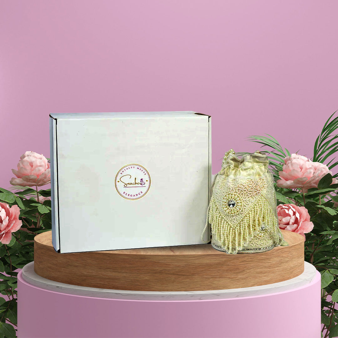 Emanating grace and vintage charm, the Ivory Pearl Embellished Potli Bag is designed for brides, bridesmaids, and anyone seeking elegance for special occasions. Handcrafted with intricate pearl work, floral rhinestone embellishments, and delicate lace overlay, this potli bag is a timeless accessory that exudes luxury. Its beaded handle adds a regal touch, perfect for wedding events, receptions, or festive evenings.