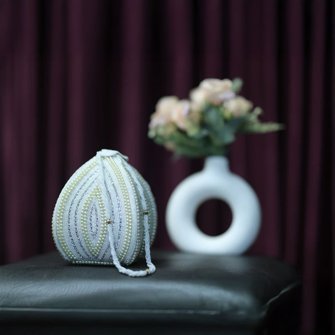 Elevate your ethnic attire with this Pearl Embellished Bridal Drawstring Potli Bag in pristine white. Designed with intricate pearl detailing and delicate beadwork, this potli is both graceful and grand. Its lotus-inspired shape and handcrafted texture make it a beautiful companion for bridal trousseaus and festive events.