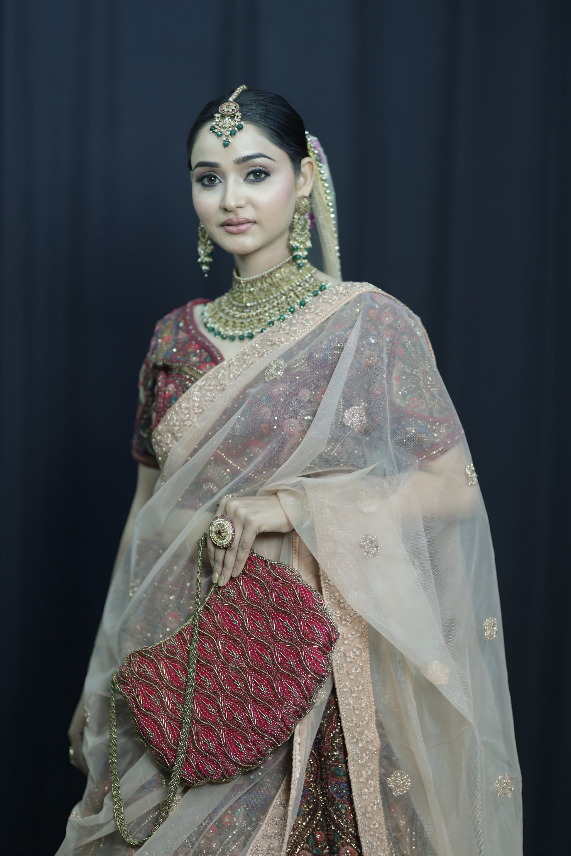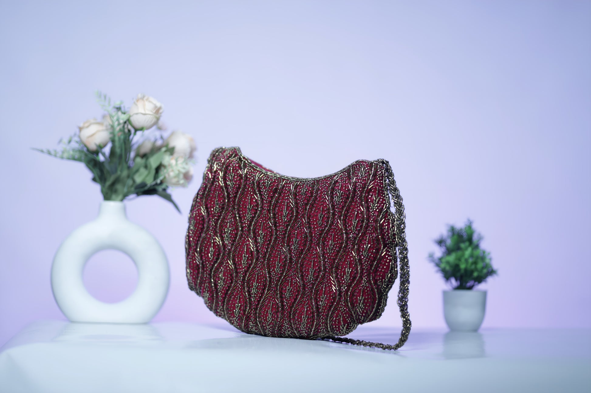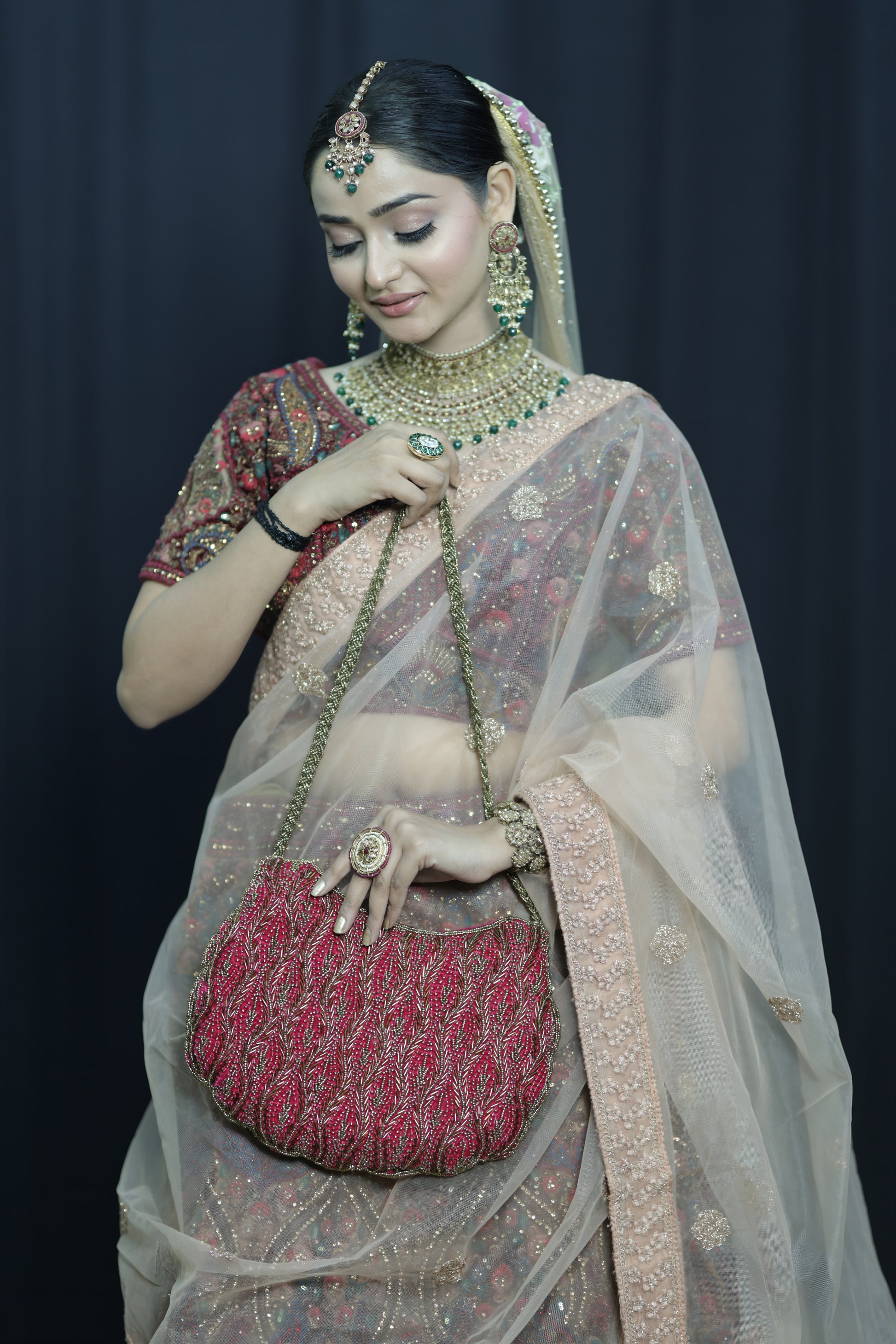 Turn heads with this rich and artistic pink and gold beaded evening handbag. Intricately hand-embroidered with wave-like zardozi work, it blends traditional craftsmanship with modern elegance. The shimmering scarlet base is overlaid with antique gold beadwork in a wave pattern, offering a stunning texture and depth. Ideal for weddings, festive occasions, or adding a statement to any ethnic outfit.