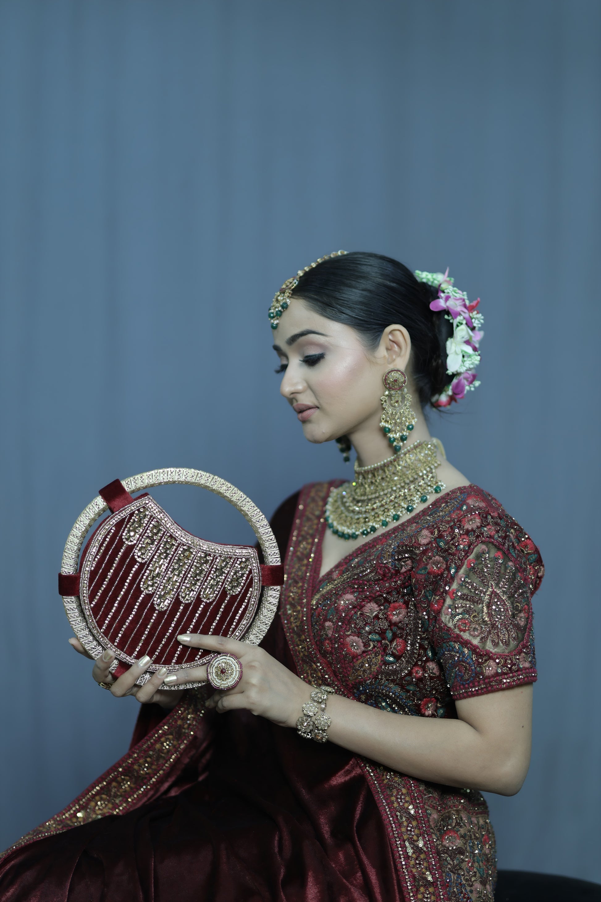 Make a royal statement with the Regal Ruby Round Handbag, a distinctive circular purse featuring rich maroon velvet adorned with intricate golden zardozi and sequin embroidery. The bag’s standout circular metallic handle, wrapped in velvet ribbon, blends opulence with contemporary elegance — perfect for weddings, sangeet nights, or festive gatherings.